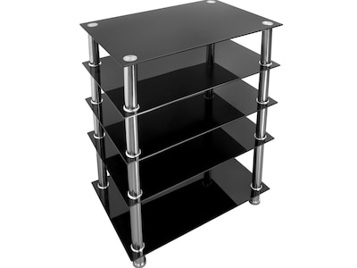 - Five-tier media stand has a spacious surface area to accommodate medium to large components