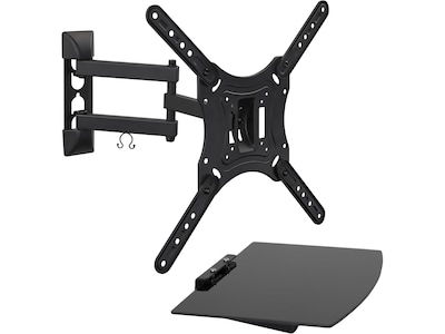 - Full-motion TV wall mount with shelf conveniently holds your DVD player, gaming console, or other media devices near your TV for an easier connection