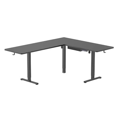 Upgrade your workspace without sacrificing room to work. This extra large corner desk with electric height adjustment combines a spacious three-piece desktop with a flexible design that fits into either corner configuration, making it perfect for home offices, creative studios, and executive setups. Thanks to the powerful dual motor system, you’ll enjoy smooth, reliable height adjustments between 28.3" and 46.5" — all while operating quietly at less than 55dB, so you can stay focused without distractions. Built on a solid steel frame with a 176 lb. weight capacity, this desk supports heavy monitors, laptops, printers, and accessories with ease. The user-friendly control panel lets you save three custom height settings for effortless transitions between sitting and standing throughout the day. Safety features like anti-collision technology automatically stop movement when an obstacle is detected, protecting both your equipment and your desk against damages. Stay organized with thoughtful accessories including a fabric drawer, integrated cable management, and two handy hooks for bags or headphones. Available in black, white, or rustic brown tabletop finishes with your choice of a black or white base, this desk is as stylish as it is functional — designed to help you work smarter, move more, and feel better.