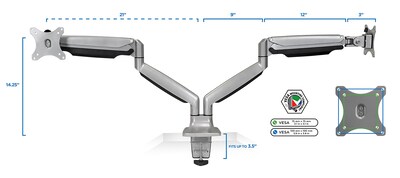 - Fits 2 screens from 13" - 32" in size, with a maximum support weight of 20 pounds each, using the 75x75mm or 100x100mm VESA square bolt hole pattern found on the back of the monitors. Comes with interchangeable C-clamp or grommet base mount for use on desktops