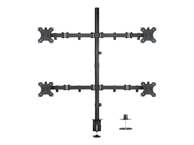 Raise your monitors to an ergonomic position and work more efficiently with this quad monitor mount. Designed for performance, this quad mount is made from high-strength steel for durability. Includes both clamp and grommet installation components to fit a variety of desktops. Each pair of arms can be raised and lowered on the pole for easy height adjustment. Tilt and swivel offer multiple monitor angles for comfortable reading, and integrated cable management keeps your cords off your desktop. All necessary instructions and hardware included.