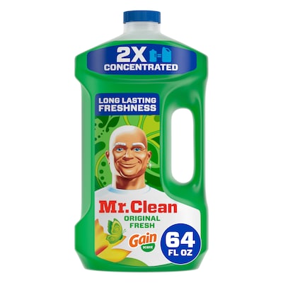 Mr. Clean's two times more concentrated liquid formula muscles through 100% of dirt and grease for powerful, multi-surface cleaning. This cleaner is great for mopping as well as cleaning linoleum, tile, and hardwood floors. Use the Mr. Clean all-purpose cleaner all around the house to clean toilets, sinks, and bathtubs. This multi-surface cleaner even works outside on garbage cans, doors, and more. It makes cleaning your house that much easier and leaves the long-lasting freshness of the Gain Original Fresh scent behind. Add Mr. Clean to your arsenal of cleaning supplies today.