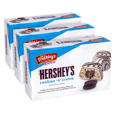 Mrs. Freshley's and HERSHEY'S a combination made in snack heaven. COOKIES 'N' CREME-inspired snack cakes with baked-in cookie bits are filled with rich, delicious chocolate creme made with real HERSHEY'S Cocoa. Put your feet up and take a bite out of the delectable goodness of these tasty snacks. Individually wrapped snack cakes make it easy to pack for lunch or stock up the pantry for after school and late night treats. Mrs. Freshley's makes life sweeter with its satisfying snacks and treats. Snack time just got epic. Mrs. Freshley's is an award-winning brand synonymous with innovation, quality and great taste for over 25 years. From new favorites to must-have classics, Mrs. Freshley's is a sweet delight in every bite.