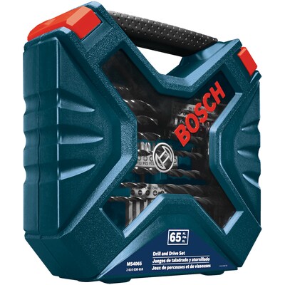 The Bosch 65-Piece Drill/Drive Mixed Set features driver and drill bits for all-in-one convenience. This set also comes with a variety of accessories to help solve general drilling and fastening tasks. The included driver bits are designed to lessen damage to the screw head and provide better bit-gripping power. This set features drill bits for wood, metal and masonry. Organize all your bits with ease in the easy-to-use case.