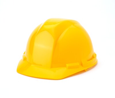 Mutual Industries 4-Point ratchet suspension yellow hardhat features a 4 point adjustable nylon suspension for shock absorbing protection. Hat includes reinforced ribs on top for additional impact protection and slotted sides for accessories.