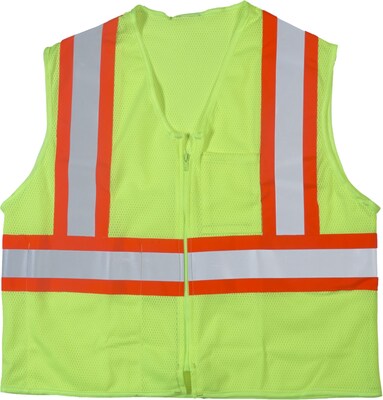 Mutual Industries MiViz 2XL/3XL lime ANSI class 2 mesh vest is made of 3.4 oz high visible durable, breathable material for comfort and features 4" orange/silver/orange reflective tape.