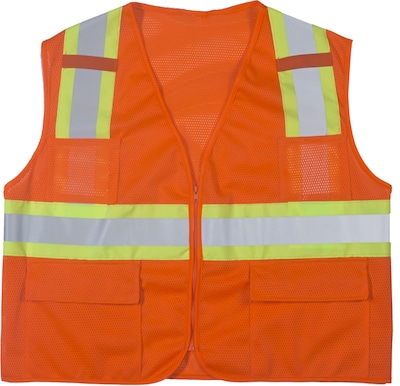 Mutual Industries MiViz XL orange ANSI class 2 mesh surveyor vest is made of 3.65 oz breathable, 100 percent knit polyester mesh for comfort and features 4" lime/silver/lime reflective tape.