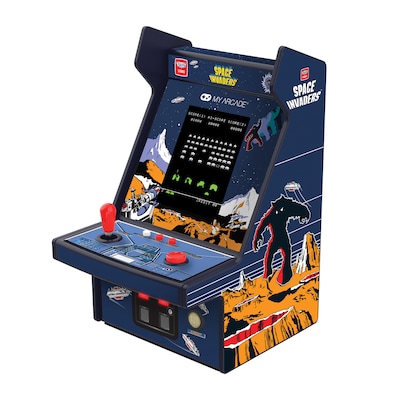 Introducing the officially licensed Space Invaders Micro Player Pro Portable Retro Arcade from My Arcade, the ideal addition to any game room, office, or display case! This 6.7-in. tall cabinet features artwork inspired by the original Space Invaders arcade cabinet, transporting you back to the golden age of gaming. Enjoy high-resolution gameplay on the 2.75-in. full-color vertical display, which showcases the classic graphics in all their retro glory. With a built-in speaker and adjustable volume control, you can immerse yourself in the iconic sound effects and music of this beloved game. Alternatively, plug in your headphones using the 3.5-mm port to keep the action to yourself. Customize your gameplay experience with adjustable screen brightness, and power up with either 4 AA batteries or a USB-C cable (neither included). With its compact size and portability, you can take your Space Invaders Micro Player Pro with you wherever you go. Don't miss out on the chance to own a piece of gaming history. Get your Space Invaders Micro Player Pro Portable Retro Arcade today!