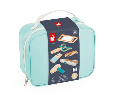 Time for a trim" This attractive case includes a straightener, a comb, a pair of scissors, a mirror, a hairdryer and a razor - everything you need to emulate your favourite hairstylist! Once you're finished playing, all six accessories in the set fit neatly in the case,and its fabric handles mean it's easy to carry, too. It's a great make-believe toy for feeding your child's imagination. Water-based paint. Make-believe toy for children aged 3 and over.