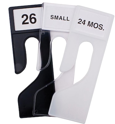 King size, white plastic size divider with open slot for changing size inserts. This rectangular shaped king size divider measures 10 ¾”H x 3 ¾”W with a 1 3/8” inner dimension opening. Includes a choice of NAHANCO’s E1-BLANK white inserts or pre-printed sizes in black ink, style E1 inserts.