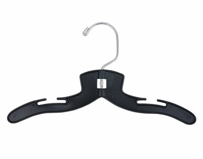 10" super heavy weight black plastic shirt/dress hanger with chrome swivel hook and deep notches for straps. Our smallest top hanger. Appropriately sized for young children's and baby's outfits. Qty per carton: 200