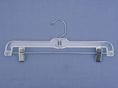14" clear break resistant jumbo weight skirt/slack hanger with chrome hardware for hanging skirts slacks and coordinates.