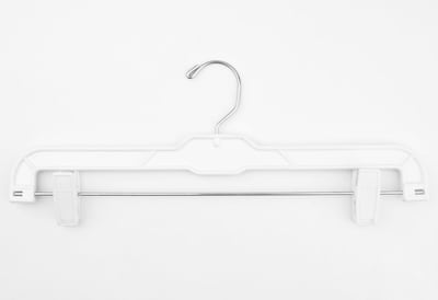 14" White Plastic Pant Hangers with Coordinating Plastic Clips.
