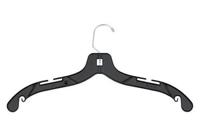 Medium weight dress hanger of 17" is black colored and is best suited for t-shirts, light weight tops and sweaters.