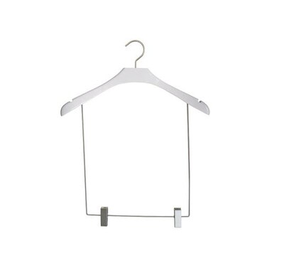 Concave display hanger of color low gloss white finish is made of wood and comes with a brush chromed hook.