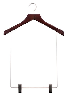 Concave display hanger of color low gloss mahogany finish is made of wood and comes with a brush chromed hook.