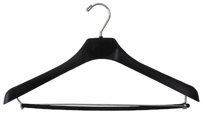 Plastic 18” concave suit hanger in a textured black finish with a locking skirt/pant bar and chrome hardware. Ideal for plus size clothing and heavier tops/bottoms, measuring 1 3/8" shoulder width to support garments without sagging. Strong, sturdy construction with a smooth area below the hook for applying labels and branding. Concave shape adds fullness on the rack and makes a strong presentation. Qty per carton: 50
