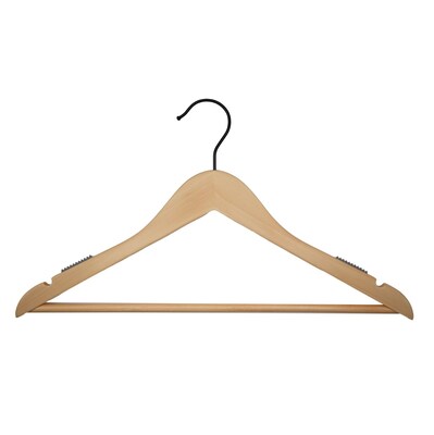Stylish, professional grade 17” low gloss natural wooden suit hangers with pant bar, inset grippers, and black hook are a sleek addition to any space. These hangers are smooth and coated with lacquer for beauty and durability, for long-lasting use on retail racks or in your laundry room or closet.