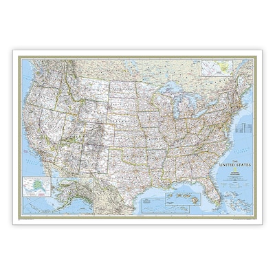 Expertly researched and designed, National Geographic's United States wall map is the standard by which other reference maps of the U.S. are measured. Signature Classic styling with bright, easy to read color palette with blue water and colorful state borders. All 50 states with insets for Hawaiian Islands and Alaska plus inset showing relative size of Alaska. Clearly defined state and country boundaries, cities, islands, national parks, and physical features. Thousands of place names carefully and artfully placed to maintain legibility in heavily populated areas. Background shows mountain ranges and valleys in subtle shaded relief with mountain ranges labeled. Major water bodies including rivers, lakes, gulfs, bays, straits, and ocean bathymetry. Transportation routes including interstate highways, major state routes, airports, waterways, canals, and ferries.