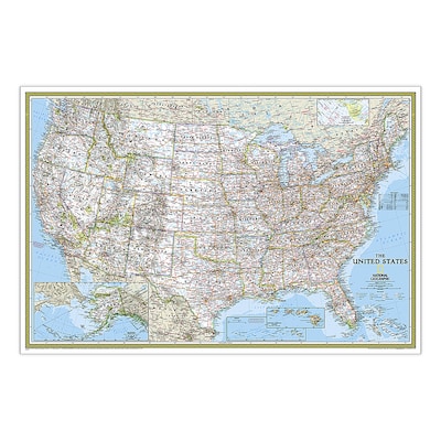 Expertly researched and designed, National Geographic's United States wall map is the standard by which other reference maps of the U.S. are measured. Signature Classic styling with bright, easy to read color palette with blue water and colorful state borders. All 50 states with insets for Hawaiian Islands and Alaska plus inset showing relative size of Alaska. Clearly defined state and country boundaries, cities, islands, national parks, and physical features. Thousands of place names carefully and artfully placed to maintain legibility in heavily populated areas. Background shows mountain ranges and valleys in subtle shaded relief with mountain ranges labeled. Major water bodies including rivers, lakes, gulfs, bays, straits, and ocean bathymetry. Transportation routes including interstate highways, major state routes, airports, waterways, canals, and ferries.