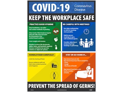 National Marker Keep the Workplace Safe COVID-19 poster reminds employees to help mitigate the spread of harmful germs by taking the easiest of steps, such as practicing good hygiene, being careful with meetings, handling food carefully, staying in or going home if you are sick.