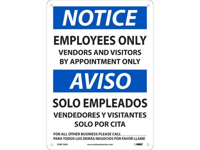 Mark the facility wall with this National Marker safety awareness wall sign to inform your employees, vendors, and visitors about the entrance rules with the message "Notice. Employees Only. Vendors and Visitors by Appointment Only" imprinted in English and Spanish. Standard aluminum has baked-on enamel on both sides. It is weatherproof and noncorrosive, making it perfect for indoor and outdoor use. The sign is supplied with radius corners and predrilled mounting holes. Excellent for placement on a wall or fence.
