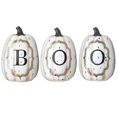 This Halloween decoration features three bright white oblong pumpkins with black stems. Each has an ornate bronze-colored scrollwork that encircles an individual black letter altogether spelling BOO. All three pieces are constructed of sturdy polyresin material with hand painted detail.