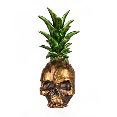 This unique tabletop Halloween trimming is sure to bring a second look. At first glance it is a pineapple with a tall stalk, at closer inspection the stalk grows from the top of a creepy hollow-eyed skull. It is constructed with a combination of stone powder and poly resin materials and finished in a gold metallic paint. This free-standing table piece will add frightening fun to your Halloween decorating scheme.