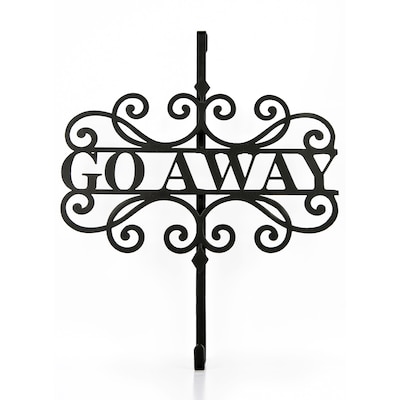 This ornate hanger offers an added greeting to your Halloween wreath display. Constructed of all steel with a matte black finish, the tongue-in-cheek message “Go Away" is centered between swirling scrollwork. This unique door hanger offers fun and function, perfect for hanging a wreath celebrating the Halloween season. For indoor or outdoor use.