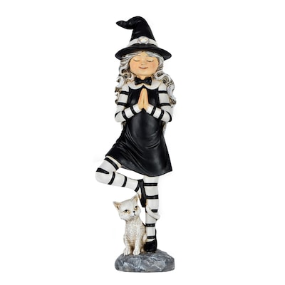 Enjoy a bit of Halloween harmony with this serene yoga posing witch tabletop decoration. Contently standing with eyes closed in the yoga ‘tree’ position, dressed in a striped outfit and traditional pointed hat, a white cat at her feet. Constructed of durable poly resin with hand painted detail, this free-standing table piece will add fanciful fun to your Halloween decorating scheme.