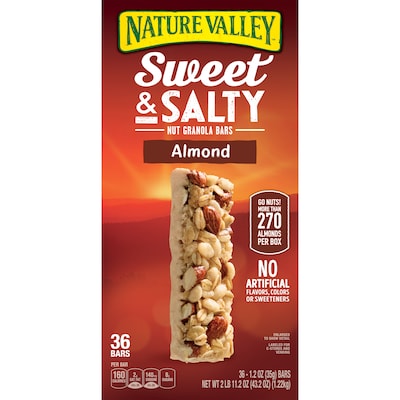 Delight in the taste of these almond granola bars. They're made without artificial flavors, colors, or sweeteners for a more healthy treat. Each bar is individually wrapped for convenience. This box of Nature Valley granola bars has 36 bars, so you won't have to restock for a while.
