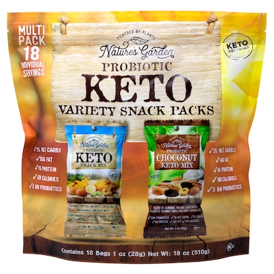 An 18 count pack of Nature's Garden Probiotic Variety Snack Packs with 9 - 1oz indiviudal servings of Probiotic Keto Snack Mixes and 9 Choconut Keto Mixes. Both mixes are high in fat and protein but low in carbs making them a great Keto certified snack. Whether you prefer salty and cheesy or coconut and chocolate this snack pack variety has it all!