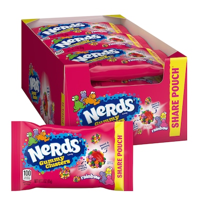 Nerds Gummy Clusters Candy consists of crunchy mini Nerds around a sweet gummy center. The combination of crunchy Nerds and a gummy center makes it an addicounting snack, so beware once you open the bags! The poppable treats include the Nerds Rainbow variety, which includes strawberry, grape, orange, and lemonade, so there will never be a shortness of flavor.