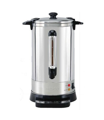 The Nesco Coffee Urn is constructed of stainless steel and features double wall insulation, allowing it to retain heat longer than single wall models. Its hefty capacity can hold up to 50-5.7 oz. cups. Approximate brewing time is one cup per minute. Green indicator light lets you know when coffee is ready to be served. With locking lid and stay-cool handles to help prevent mishaps, this urn is truly a crowd pleaser.