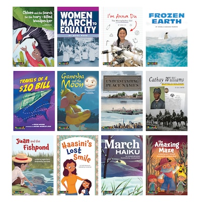 Celebrate Rich and Diverse Voices and Identities - Clear Windows is an exciting, forward-thinking new collection of 36 fiction and nonfiction texts that promote multiple perspectives, critical thinking, and knowledge building. Set includes 1 each of the following titles: Chloe and the Search for the Ivory Billed Woodpecker (Science, L), I'm Anna Du (Sci, M), Women March to Equality (SS, K), Frozen Earth (Sci, L), Juan and the Fishpond (LA, M), Haasini's Lost Smile (LA, K), March Haiku (Sci, K), The Amazing Maze (LA, K), Travels of a $10 Bill, Ganesha and the Moon (LA, L), Understanding Place Names (SS, M), Cathay Williams: Buffalo Soldiers (SS, K)