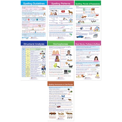 Graphically stimulating, well-organized and highly educational, the Spelling Rules Bulletin Board Chart Set provides an excellent reference resource for your classroom bulletin board or wall, or as a hands-on activity for instruction, review and reinforcement for students in your Reading/Language Arts curriculum. The Spelling Rules Bulletin Board Chart Set includes a collection of 7 individual 12" x 18" laminated charts, each covering a separate, curriculum topic. Uniquely designed, Side 1 features a graphic overview of the topic while Side 2 provides "write-on/wipe-off" activity exercises for review and reinforcement. Perfect for classroom or for use in learning centers/small group activities; independent study and remediation; or as a teacher resource for introduction and review of key concepts. Topics covered: Root Words, Prefixes, Suffixes; Spelling - Plurals & Possessives; Homophones; Spelling Patterns; Spelling Common Homophones; Spelling Guidelines; and Structural Analysis.