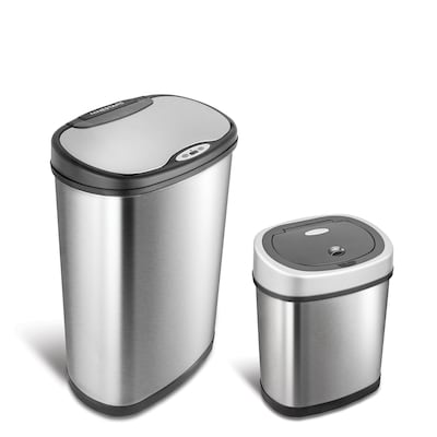 Nine Stars Touchless Automatic Motion Sensor Trash Can Combo Set is ideal for any home or office. The lids will automatically open when your hands are detected within sensor range, preventing cross-contamination from germs. The trash can features an infrared motion sensor that detects when your hand or trash is within 10 inches of the sensor. Nine Stars automatic trash can with stainless steel lid opens to let you to throw out your trash and then it closes automatically when you remove your hand. Durablestainless-steel construction provides a classic look. The Nine Stars stainless steel trash can operates on DZT-50-13 (3 C batteries not included) DZT-12-9 (2D batteries not included) and can be opened and closed approximately 10,000 times before needing battery replacement. Also included are ring liners to hold trash bag up and conceal with in trashcan. Infrared motion sensor that detects when your hand or trash is within 10 inches of the sensor. Nine Stars automatic trash can with stainless steel lid opens to let you to throw out your trash and then it closes automatically when you remove your hand. Durable stainless-steel construction provides a classic look. The Nine Stars stainless steel trash can operates on DZT-50-13 (3 C batteries not included) DZT-12-9 (2D batteries not included) and can be opened and closed approximately 10,000 times before needing battery replacement. Also included are ring liners to hold trash bag up and conceal with in trashcan.