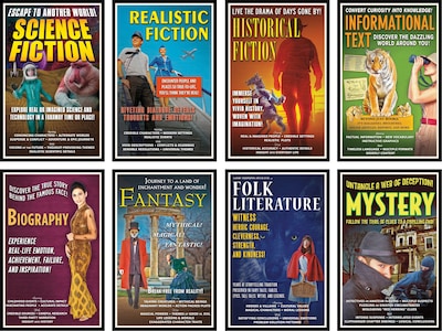 Literary genres bulletin board set acquaints students with eight major genres of literature, highlighting common themes, character traits, settings, story structures, and literary devices.