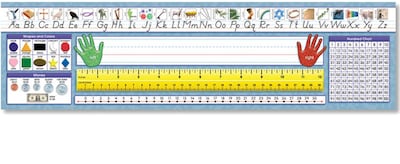 - Includes: Photo alphabet line, name plate with left and right hand prints, 12" ruler, number line (0 to 30), shapes and colors, money, hundred chart
