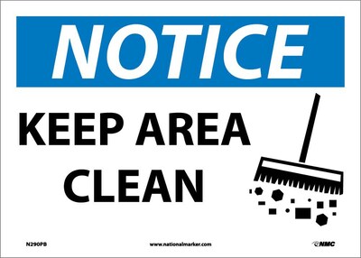 National Marker "Notice Keep Area Clean" Safety sign with graphic measures 10" x 14" and is made of adhesive vinyl material for durability.