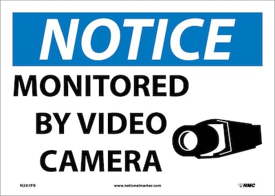 National Marker "Notice Monitored By Video Camera" Safety sign measuring 10" x 14" is made of adhesive vinyl material for durability.