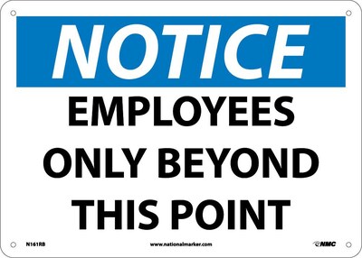 National Marker "Notice Employees Only Beyond This Point" Safety sign measuring 10" x 14" is made of rigid plastic material for durability. OSHA signs are the perfect way to alert your employees and guests when a hazard is present in your facility. Keep your facility safe, buy an OSHA regulated sign today and prevent an accident tomorrow. These OSHA signs comply with OSHA 29 CFR 1910.145
