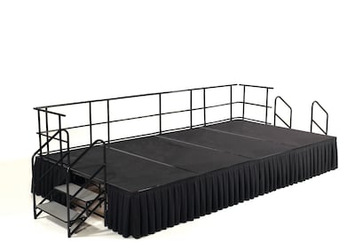 The NPS Portable Carpeted Stage Group is the reliable and affordable choice for your school performances and assemblies. Users are supported by a heavy-duty, 16-gauge steel, black powder-coated frame. The premium 3/4 inch thick plywood deck is durable and features a firmly-affixed carpeted surface. Legs are constructed with 14-gauge steel tubing and feature simple and safe spring-loaded locking mechanisms allowing for quick set-up assembly and folds up easily for manageable portable storage. The stage offers a secure weight capacity of over 200 lbs. per square foot. High-impact plastic glides will ensure floors are protected from damage. Firmly welded ganging devices let users combine equal-height stages to create a large single stage platform or assemble different sizes to create choral or band riser configurations. This set includes two stage steps, 14-gauge guardrails for extra safety, and skirting for an elegant look.