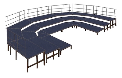 The NPS Portable Carpeted Stage Configuration is the reliable and affordable choice for your school performances and assemblies. Users are supported by a heavy-duty, 16-gauge steel, black powder-coated frame. The premium 3/4 inch thick plywood deck is durable and features a firmly-affixed carpeted surface. Legs are constructed with 14-gauge steel tubing and feature simple and safe spring-loaded locking mechanisms allowing for quick set-up assembly and folds up easily for manageable portable storage. The stage offers a secure weight capacity of over 200 lbs. per square foot. High-impact plastic glides will ensure floors are protected from damage. Firmly welded ganging devices let users combine equal-height stages to create a large single stage platform or assemble different sizes to create choral or band riser configurations. This set includes 14-gauge guardrails for extra safety. Ships fully assembled.