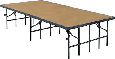 The NPS Portable Hardboard Stage is the reliable and affordable choice for your school performances and assemblies. Users are supported by a heavy-duty, 16-gauge steel, black powder-coated frame. The premium 3/4" thick plywood deck is durable and features a firmly-affixed 1/8" thick tempered hardboard surface. Legs are constructed with 14-gauge steel tubing and feature simple and safe spring-loaded locking mechanisms allowing for quick set-up assembly and folds up easily for manageable portable storage. The stage offers a secure weight capacity of over 200 lbs. per square foot. High-impact plastic glides will ensure floors are protected from damage. Firmly welded ganging devices let users combine equal-height stages to create a large single stage platform or assemble different sizes to create choral or band riser configurations. Ships fully assembled.