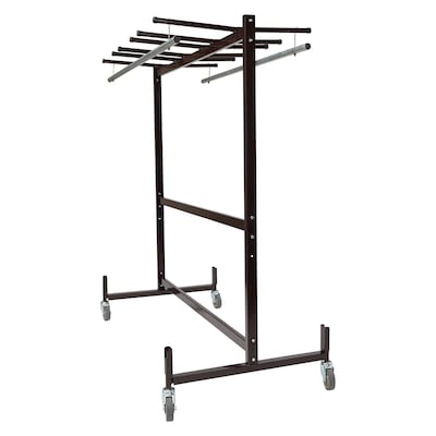National Public Seating® Combination caddy for 42 chairs / 8 - 10 tables with coat rods has a frame made of dark brown tubular steel. Rack rolls on heavy duty casters and includes 4" x 1-1/4" swivel wheels and includes two coat rods.