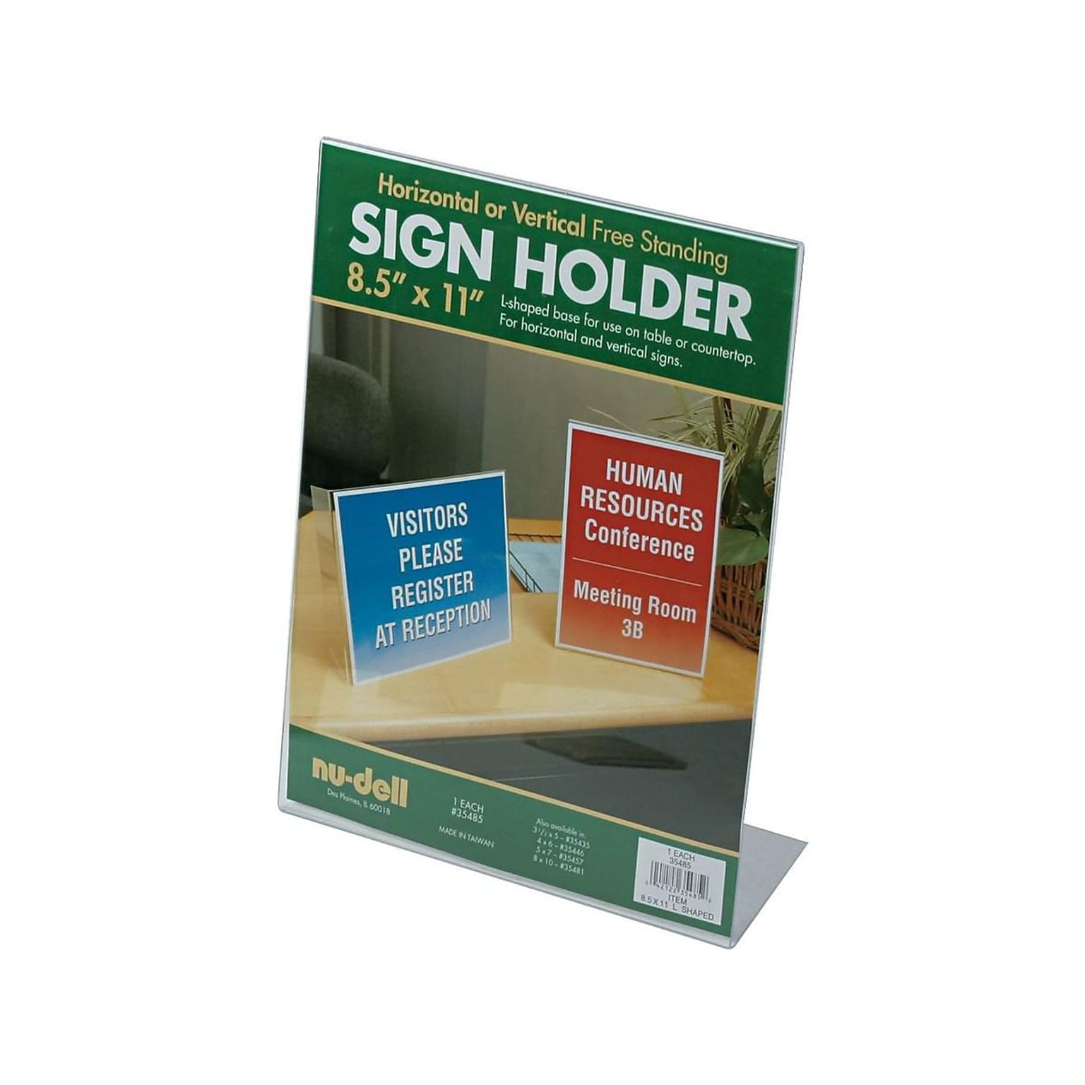 Set this letter-size L-shaped clear sign holder on a front desk or counter to draw attention to specials, announcements and other information. The sturdy plastic construction of this NuDell letter-size clear sign holder protects contents from spills and other damage.