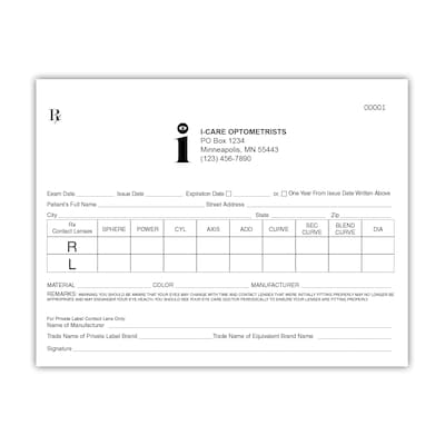 Numbered Custom Contact Lens RX Pads, Single Copy, 10 Pads per Pack