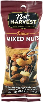 Grab a pouch of Nut Harvest Deluxe Mixed Nuts , 2.75 oz., 8 Pack and crunch your way through a hearty and crunchy mixture. Packed with Cashews, Almonds, Pecans, Brazil Nuts and Hazelnuts, this Nut Harvest Mix is a great source of healthy, nutritious snacks. Nut Harvest Deluxe Mixed Nuts , 2.75 oz., 8 Pack is great for packing in with your lunch at the office, grabbing on-the-go, or eating in-between meetings!