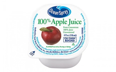 Crack open a cold one of these delicious Ocean Spray Apple Juice Cups to enjoy the refreshing natural apple juice flavor. This 48-Count bulk case is perfect for stocking up at home, the office, or hospitals, or vending machines. These No-Thaw apple juice cups are stackable, easy to open, and easy to hold. Made with no artificial colors, flavor, or preservatives, these 4-Ounce juice cups are Kosher and are unsweetened. Sit back and enjoy Ocean Spray's Apple Juice cups.